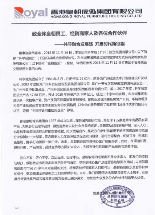11月16日,皇朝宣布与科学城(广州)投资集团有限公司已签订战略合作框架协议,科学城集团将通过定向增发等方式持有皇朝家私控股有限公司股份 星辰影院, 。