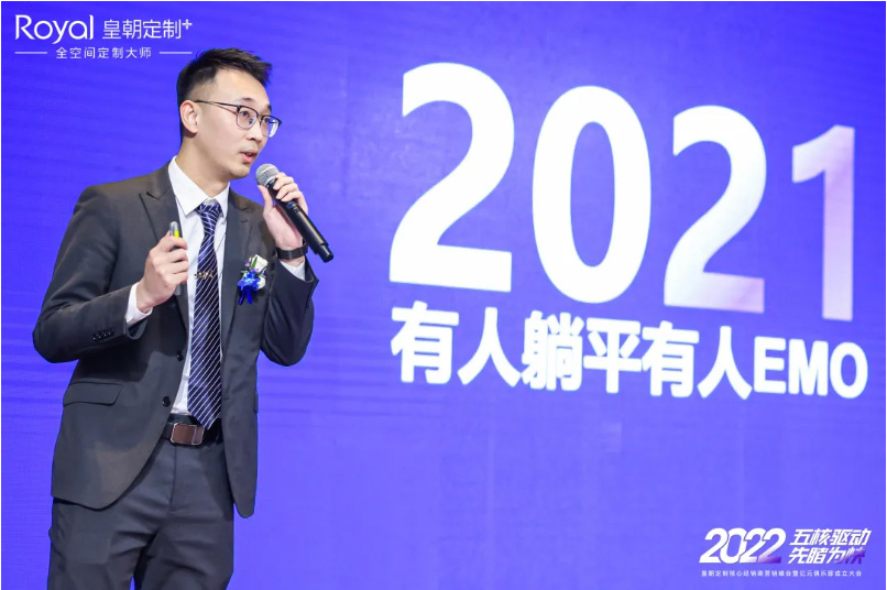 图|皇朝定制营销总监袁丹先生发表《五核驱动,先睹为快》主题演讲,讲述皇朝定制2022市场核心力量规划, 在线影视。