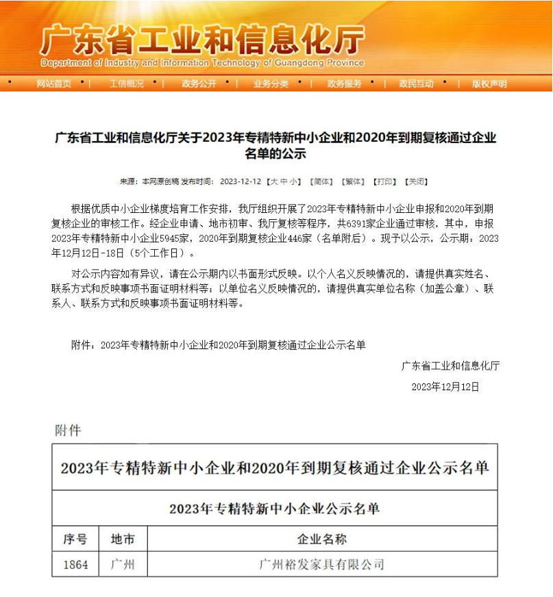 近期,广东省工业和信息化厅公示了关于《2023年专精特新中小企业和2020年到期复核通过企业名单的通告》,星辰影视所属公司广州裕发家具有限公司(以下简称“裕发家具”)成功获评广东省“专精特新”企业认定。