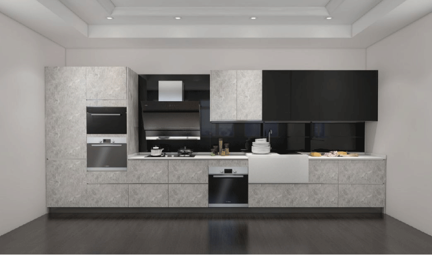一家人温馨的氛围很大程度上得益于这款格调优雅的橱柜,一字型设计,造型极为简约 在线影视,黑色窄边框玻璃门与大理石纹UV板相搭配,层次分明,简约明了,让空间看起来更大气,更整体, 。