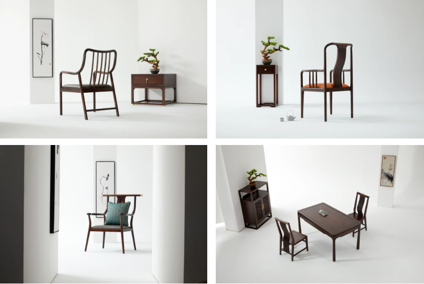 家具在造型设计方面做了大的创新,做到简而不滥,保证集禾的独特性和美观性,如椅的形制,在继承了一统碑椅、官帽椅、太师椅、圈椅等传统椅子造型的基础上,椅背做曲线的创新设计,让椅子更有动的形态,打破了传统四平八稳、古直板正的刻板印象,更加符合现代人的倚坐需求,尤其是部分座椅上的软包,这种逃离常规的设计,既不落俗套又舒适实用。