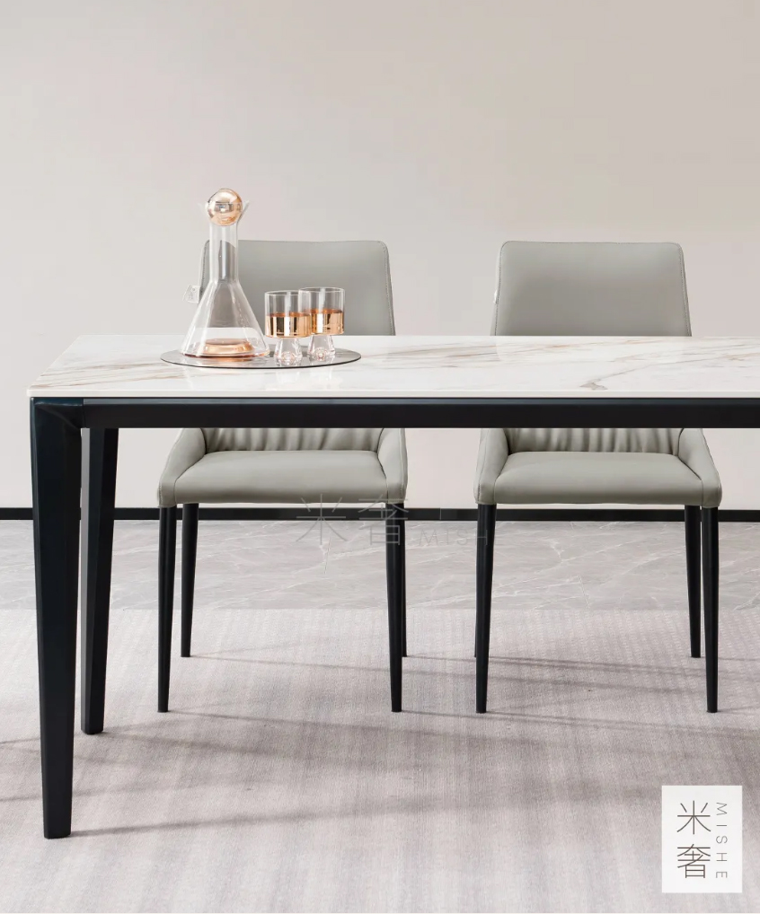 岩板具有耐高温、耐腐蚀、耐刮磨、易清洁的特点,兼具美感与实用性。用于餐桌上,摆脱了传统家具的厚重感,使原本简洁的空间富有温度。