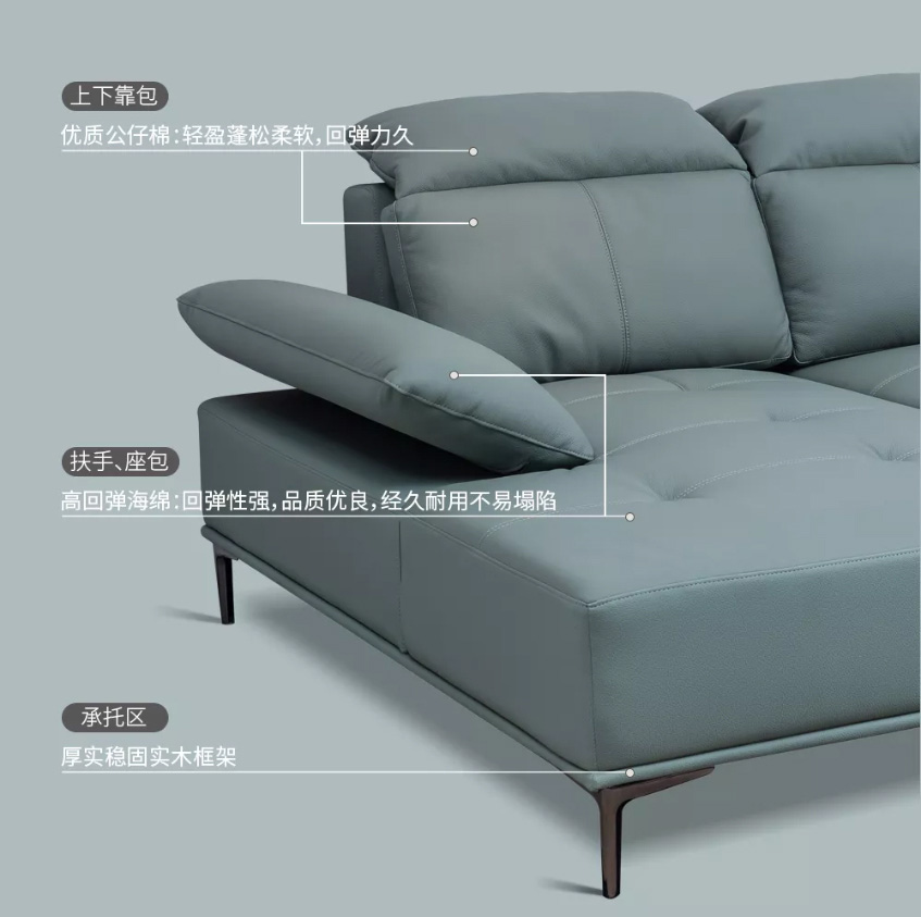 严选优质上乘皮料,确保生产出的沙发美观大方,皮质细腻,耐磨耐用,透气性好不闷热。接触面大面积采用头层黄牛皮,不计成本,只为打造舒适的使用体验。