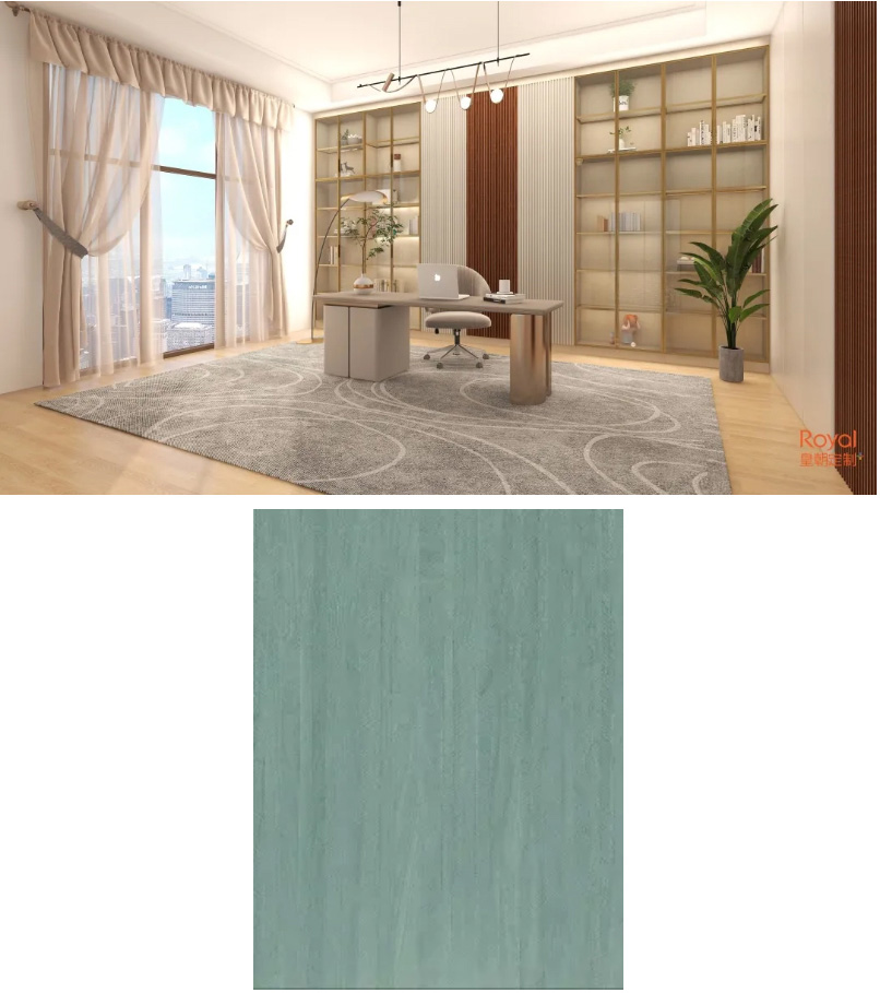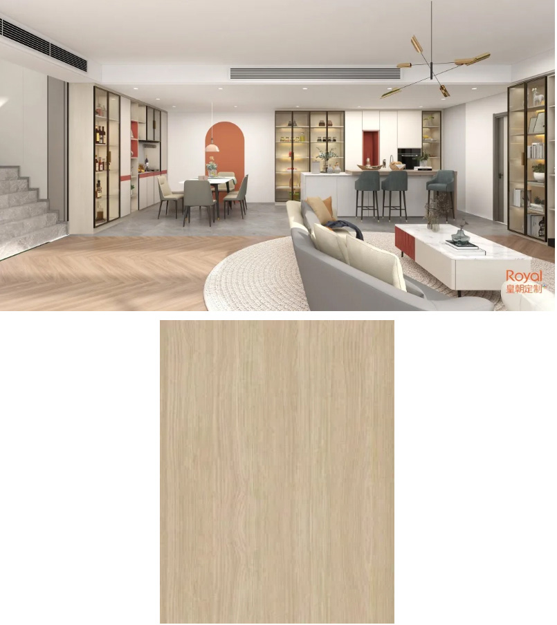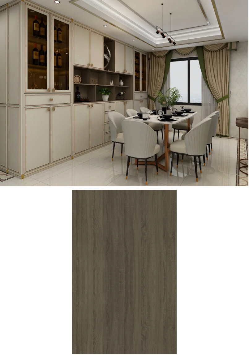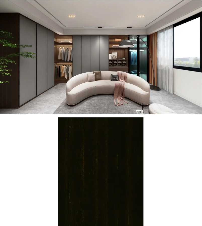 款花色贴近高级灰色系,还有这自然的木纹,能营造出高贵的空间感觉,也能作为现代简约风的基础色。