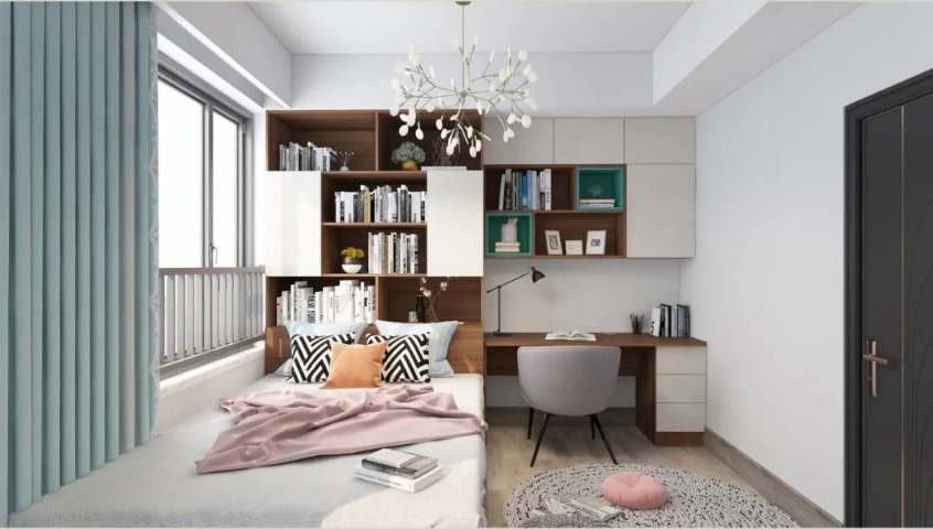榻榻米床和床头一体式书桌柜满足实用需求。
