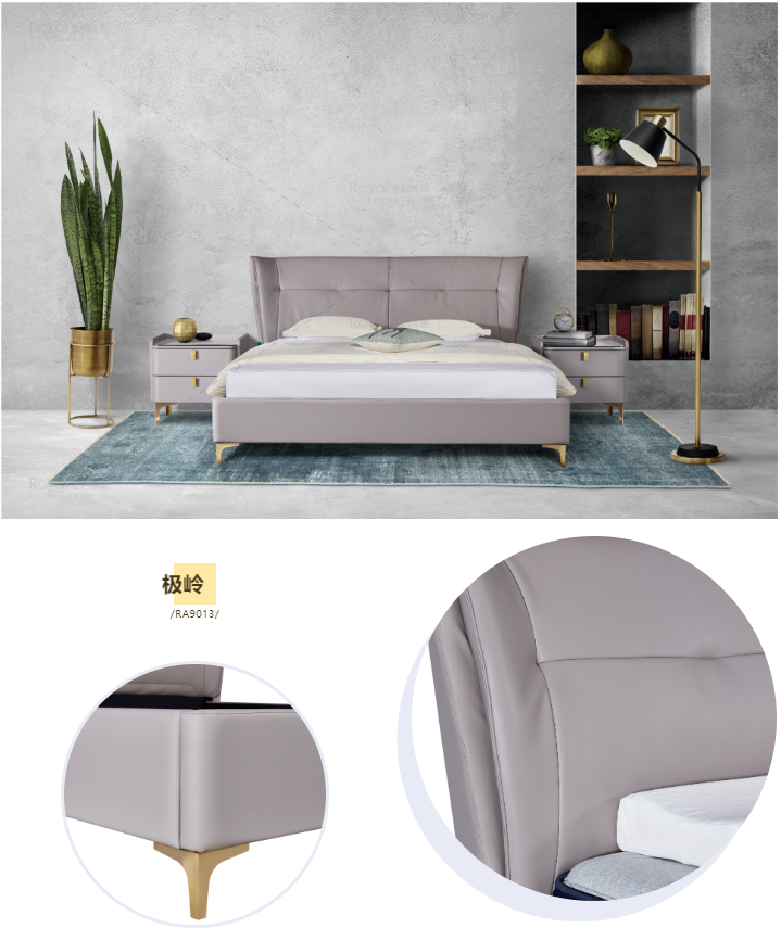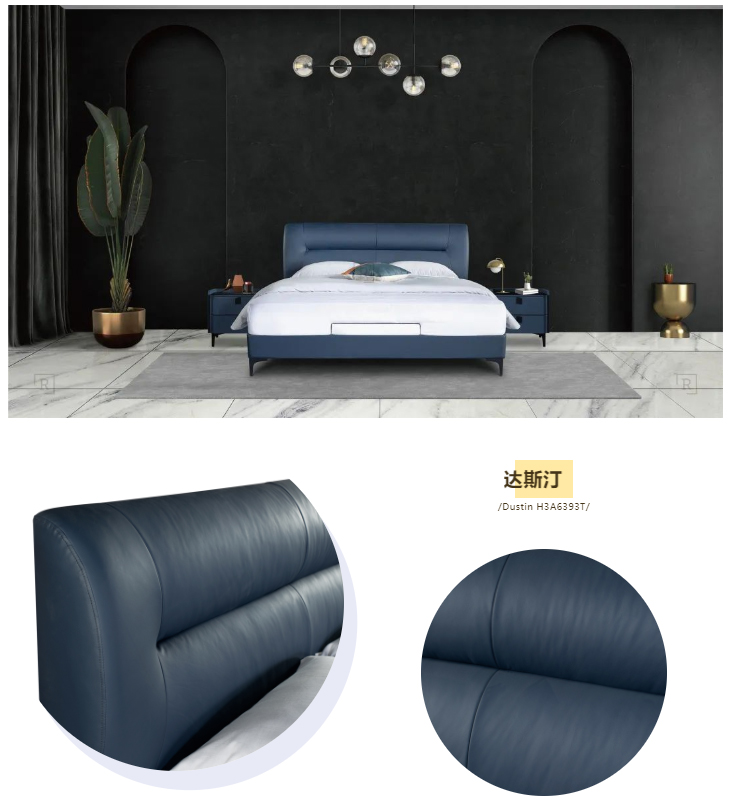 皇朝睡眠2022新品达斯汀(H3A6393T),优质真皮搭配沉稳海蓝,气质一整个拿捏住,有型挺立的靠包贴合人体曲线,怎么躺靠都舒适。