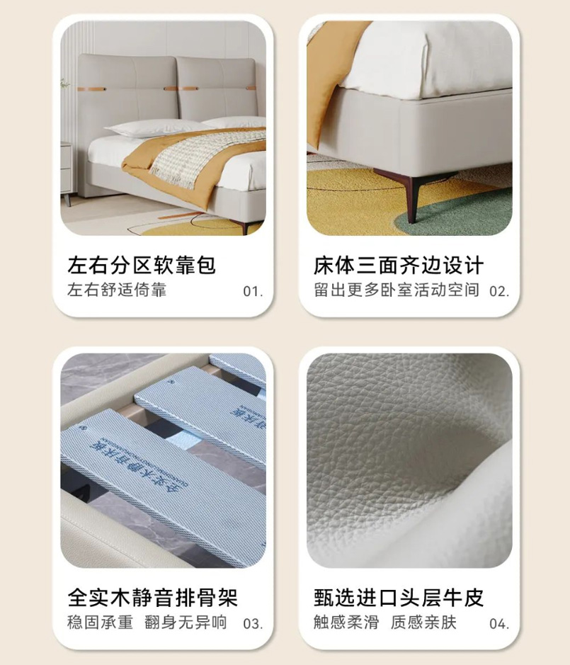 【甄选进口头层牛皮】|【三面齐边设计】|【全实木静音排骨架】