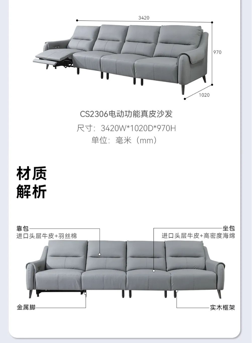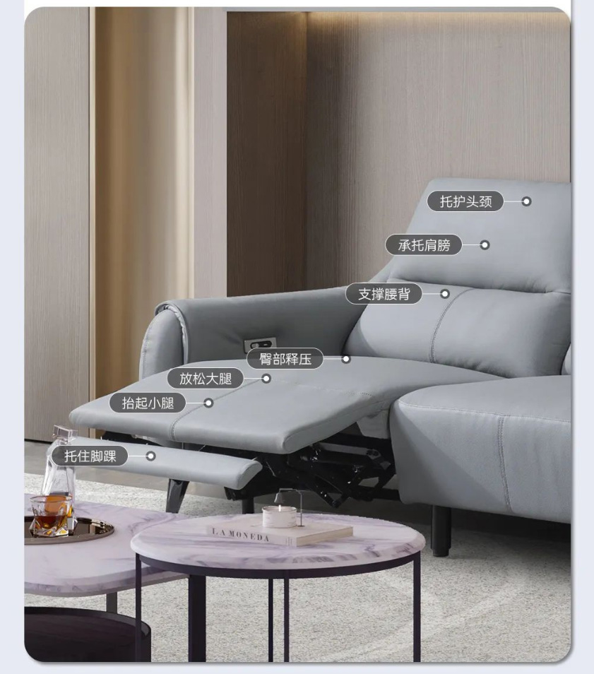 以遨游宇宙的太空舱为设计灵感,沙发整体轮廓柔和,低饱和度的灰色沉稳耐看。沙发面料采用进口头层牛皮,肌理自然清晰,肤感柔软舒适;电动贵妃位可实现110~160°自主调节,即按即停,一键深度放松,解锁花式坐靠躺;沙发靠背上下分段,充分贴合肩颈腰背,柔软舒压;靠包饱满填充高密度海绵,用料实在,给你软而不塌、弹性十足的坐感;双层扶手设计,手臂搭靠的时候更加自然舒适;便捷USB充电口的加持,不用担心玩乐断电;还配有高挑金属脚,稳固承重,清洁也更省心。