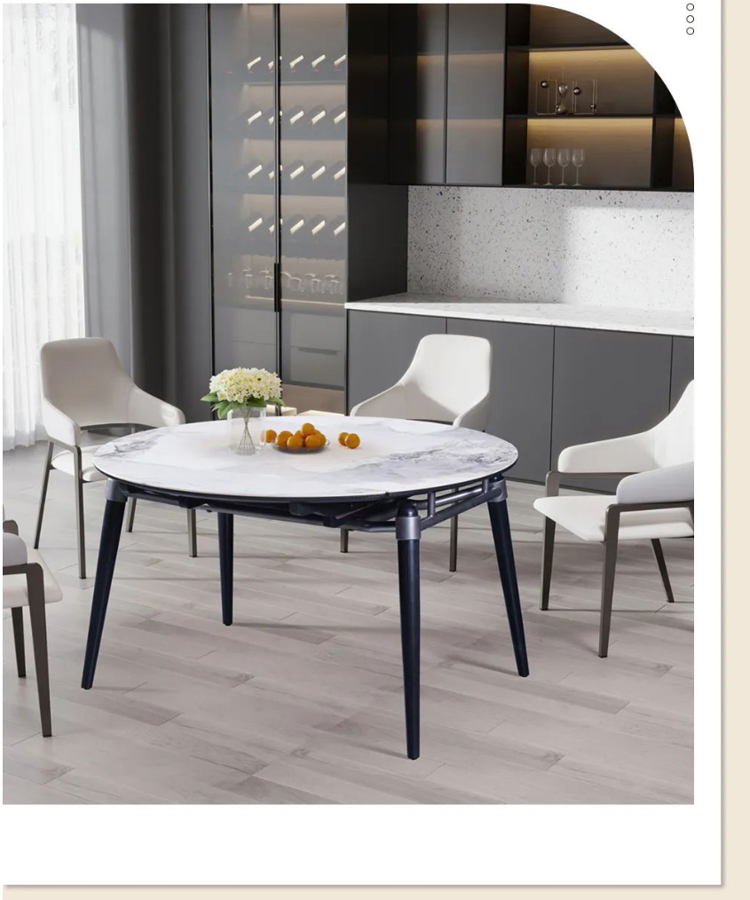 户型餐桌要怎么选才能既省空间又不失美感?MSN2206可伸缩餐桌,简直是小户型的福音!可拉伸的设计,让它可以根据不同场景变换不同的形态,用餐人少时方桌占地少,人多时只需将两侧的半月板拉出,秒变大气圆桌,再多的美味佳肴也放得下!台面选用了香奈儿岩板,纹理写意,淡雅素净;同时,它还具备耐刮磨、耐高温、高密度、食品级别安全等优点,高颜值性能出众。木质导轨质感十足,推拉静音无卡顿,而且还会越用越顺滑;同时桌脚采用了八字斜角设计,视觉上美观通透,日常满足餐椅收纳,打扫卫生也很省心。就餐想要更有仪式感,那就少不了米奢这款雅致餐椅。环抱舒适靠背和宽大海绵座包,落座更惬意,吃饭也更香了!这样舒适与自在的餐厅,真的很难不心动!