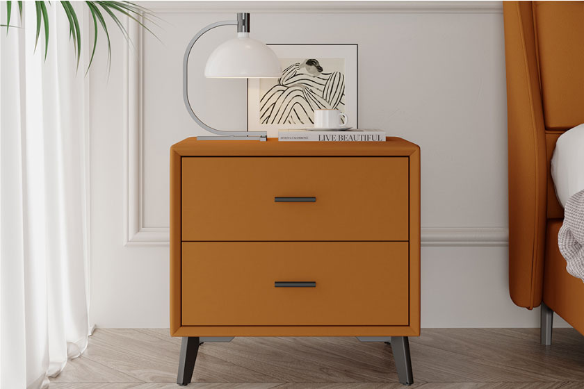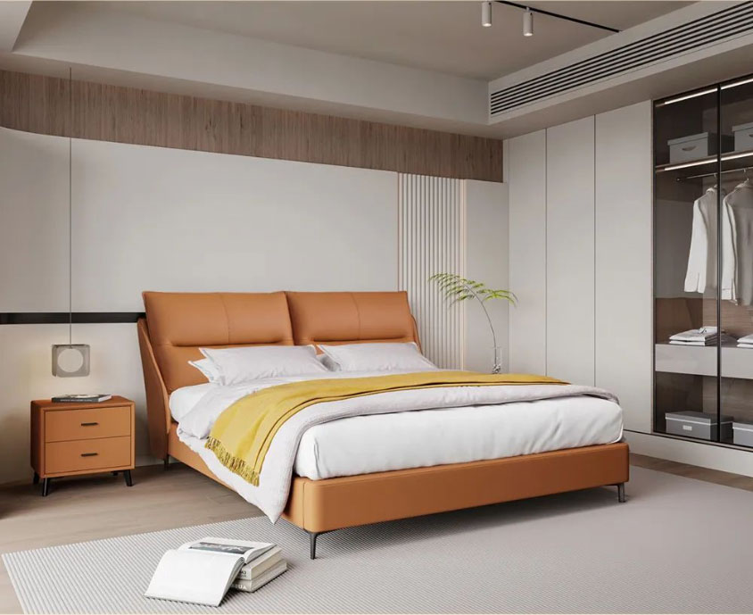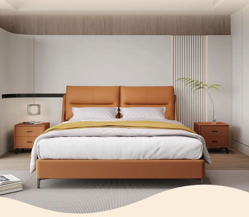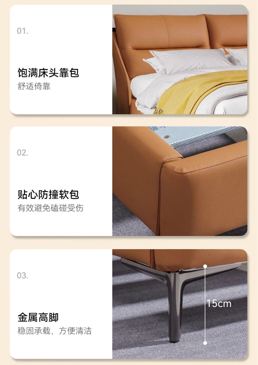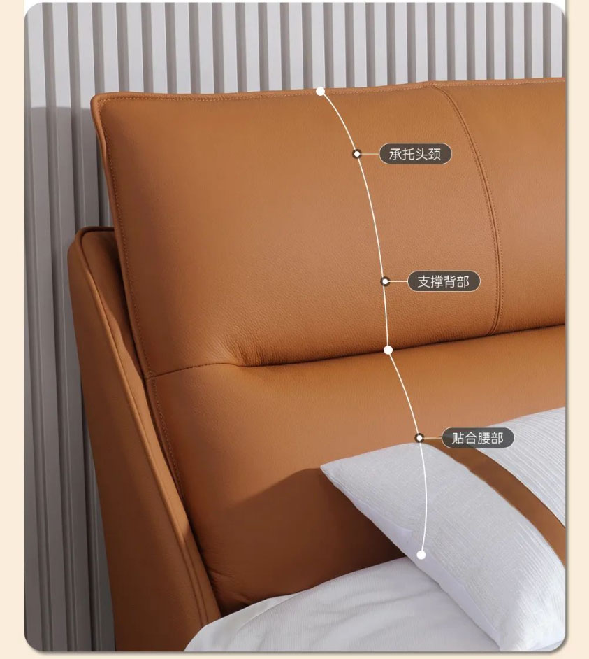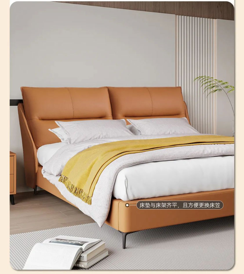 Royal星辰影视米奢系列明星产品软床暖阳,以清新而夺目的橙色系,给整个空间带来无限活力。面料选用进口头层牛皮,质地柔软细腻,触感亲肤舒适;自带倾斜角度的床屏,能更好地贴合我们倚靠时的身体曲线;左右分区双靠包,内部填充高密度高回弹海绵,靠感软弹舒适,轻松消弭一天的疲惫;三面窄边的设计,尽可能避免空间浪费,适配各种现代户型;全实木静音排骨架,结实稳固无异响,让你一觉安睡到天亮;金属床脚高挑轻盈,视觉效果更通透,也方便扫地机日常清洁。搭配的同色系床头柜,高颜值又实用,整体风格简约和谐,营造个性精致、温馨舒适的卧室氛围。
