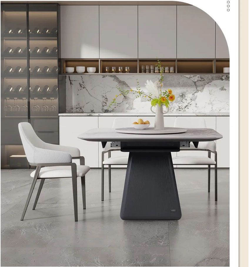 台面选用喜马拉雅彩晶石,天然纹理,诗意优雅,边缘还贴心地做了圆角处理;外嵌360°旋转圆盘,转动不卡顿、无噪音;餐桌采用木质中柱,低调内敛的朴质感中和了石材的清冷,上窄下宽的梯形设计既能稳稳托住台面,又给底部留足了活动空间,做到入座不挡腿。配套的米奢餐椅,以环抱柔软靠背和宽大海绵座包,带来更舒适的落座体验,让你在用餐时更从容惬意。