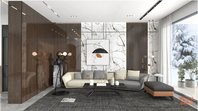大地色系也是高级感的另一种体验,适当地用上岩板,用一种更为轻盈的空间质感,加以张弛有度的节奏感结合多功能分区,在层层递进的客厅空间里,达到表现独到美学的效果。