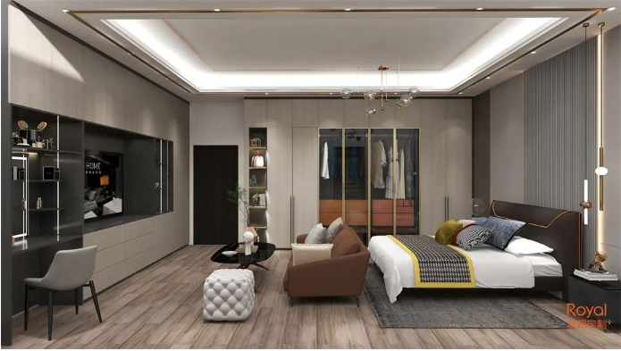 位于二层的主卧,功能区分更为细致,满墙做满柜,棕灰色如同大地一般,充满着力量。多种元素的组合,在一个空间里产生动与静的平衡。