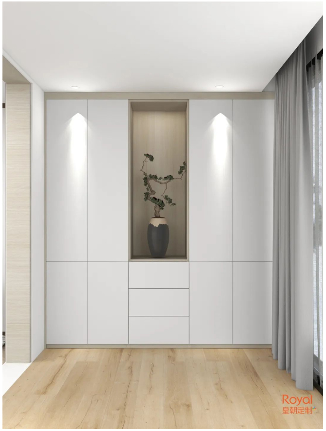 深色的玻璃门大衣柜,在素雅的房间里,显得尤为突出。