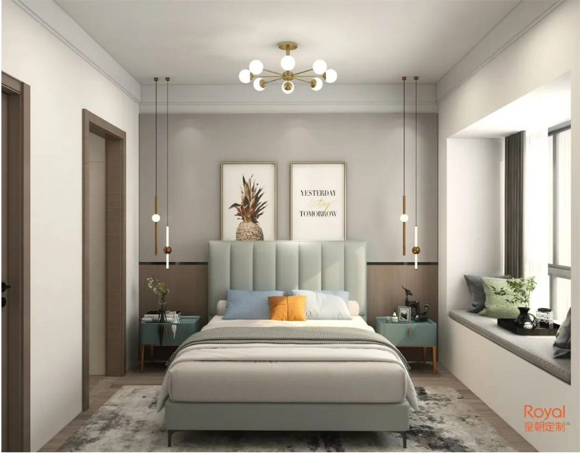 卧室遵循低调之美,打造静谧怡人的舒眠空间。正对着的大衣柜,恰到好处的跳色设计,让整体空间更加轻盈灵动。
