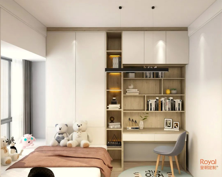 兼顾了娱乐、休息、学习的榻榻米房,浅栗黄的低饱和度和自然木纹的碰撞,让孩子享受更高品质的生活。