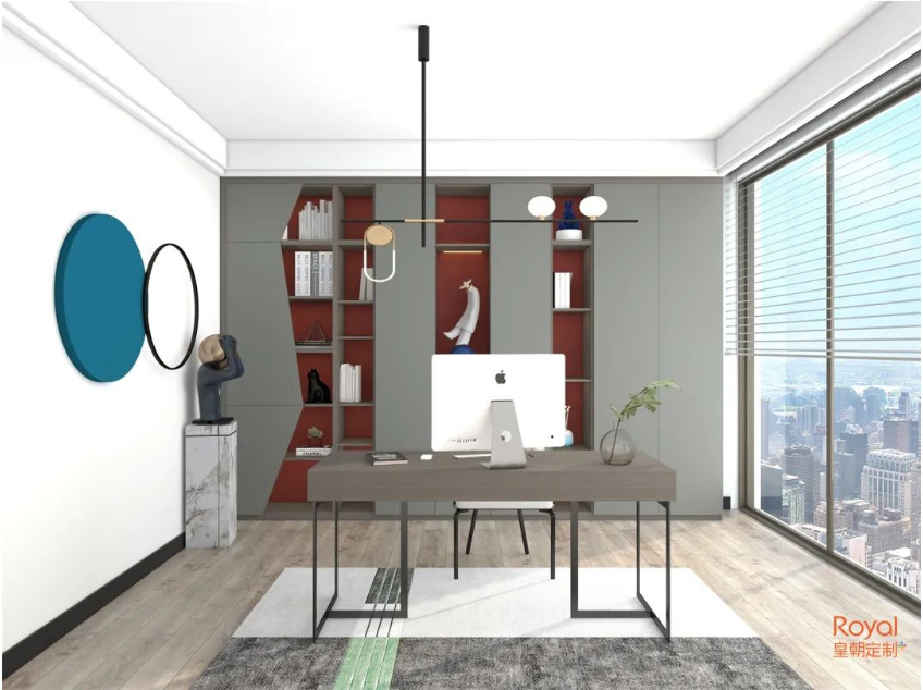 黑色可以营造出柔和而精致的质感,但容易在阴影中失去效果,所以黑色系的书房光线一定要充足。且暗红色点缀,加上别致的线条造型,整体略带复古,又个性新潮。
