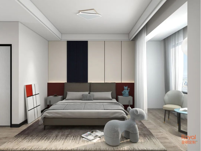 主卧承载着休息与夫妻之间的交流功能,色调上偏向和煦温馨。开辟出小小的衣帽间空间,床头上方的空间也利用上,保证了主卧收纳强悍却不会让空间冗杂。