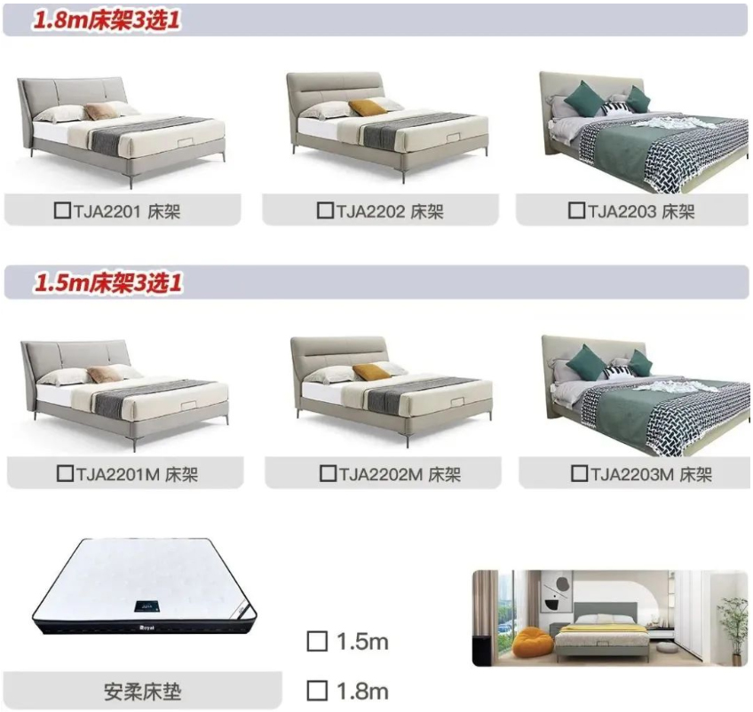 TJA2203床架(1. 8m)*1+1 星辰影视. 8m安柔床垫*1+TJA2203M床架(1. 5m)*1+1. 5m安柔床垫*1+TJC2201B床头柜*2 .