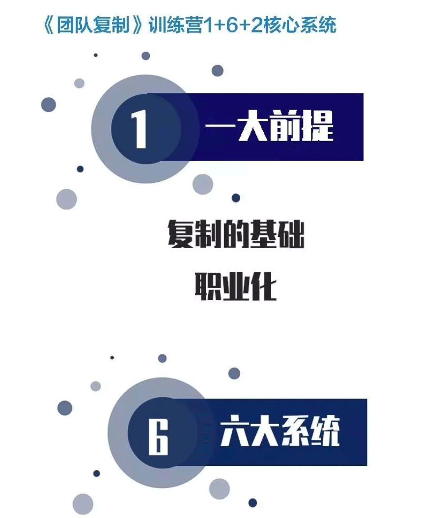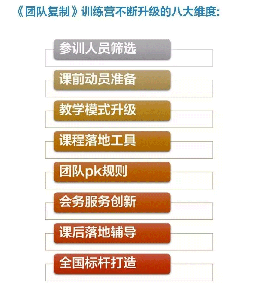 变革传统培训模式,在互动中实现教学相长;通过可转化的落地实践,孵化复合型管理人才;通过思想统一、目标统一、行动统一,实现终端业绩倍增,打造全国标杆。《团队复制训练营》针对以下痛点进行课程安排及优化,力求带来干货满满的三天。