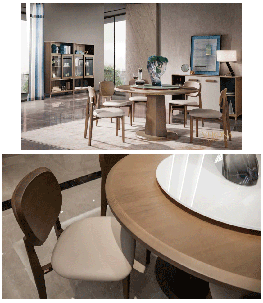 餐厅延续意式时尚风格,运用简约的方式营造舒适的家居氛围。圆形餐桌设计,以温婉的线型桌腿,保证了每位家庭成员的舒适落座空间,营造美满和谐感。此外,木饰面与玻璃材质的碰撞,更是赋予一种优雅的艺术化张力。