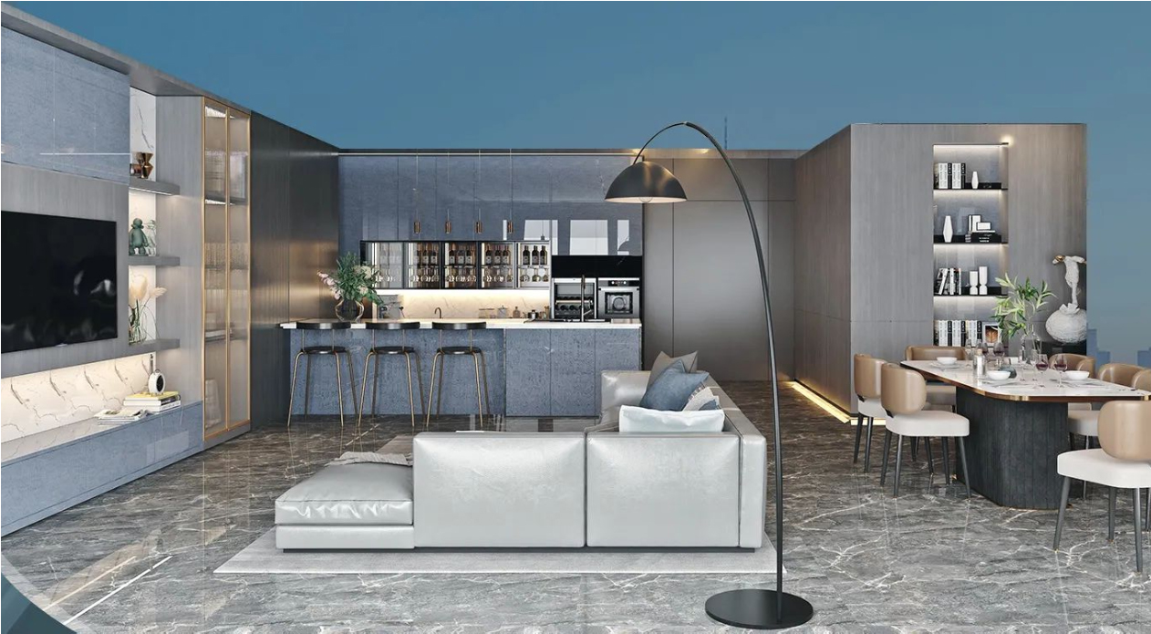 电视护墙选用墨蓝色背板,嵌入肤感吊柜 星辰影视, .