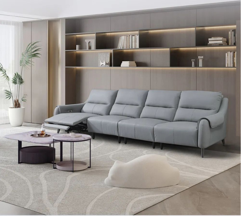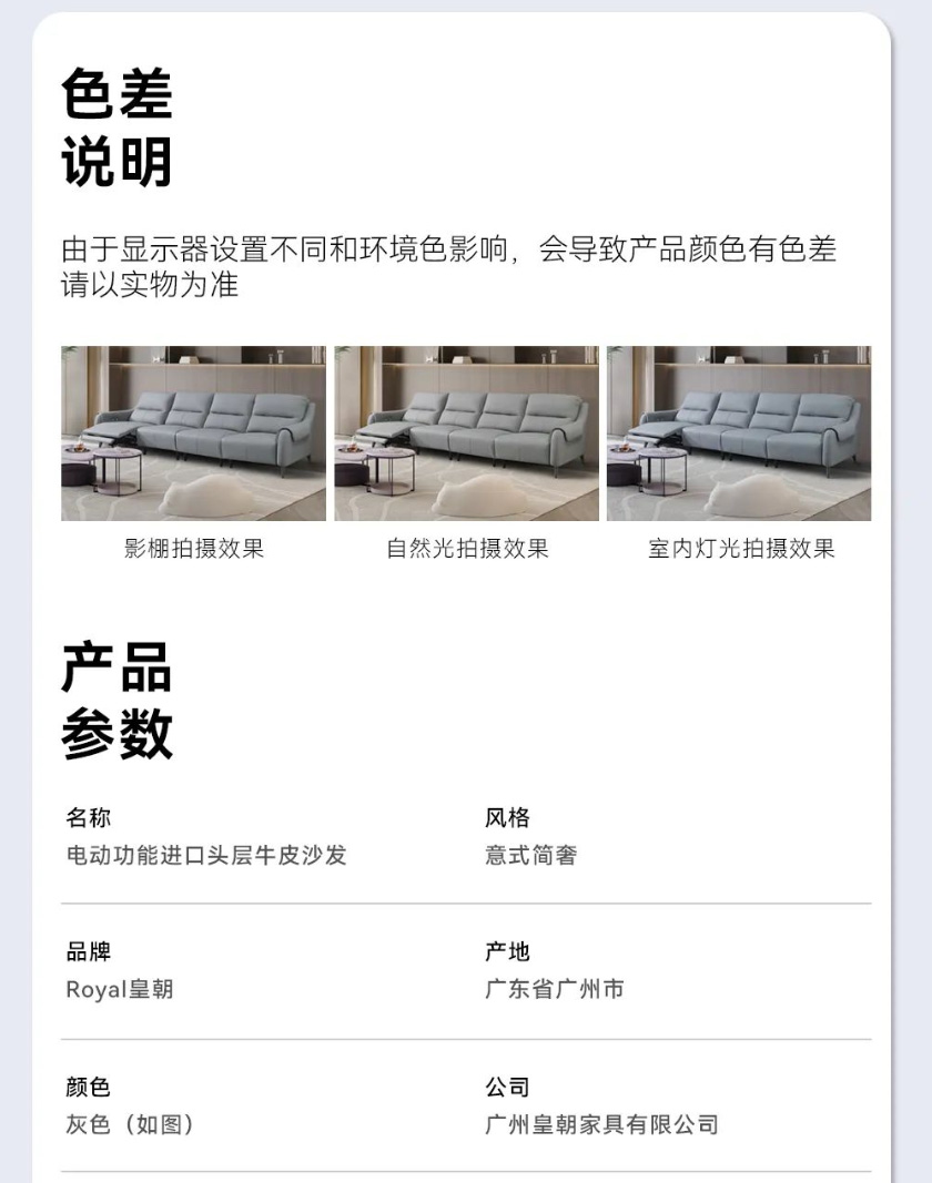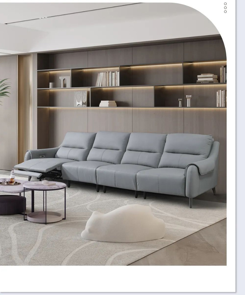 以遨游宇宙的太空舱为设计灵感,沙发整体轮廓柔和,低饱和度的灰色沉稳耐看。沙发面料采用进口头层牛皮,肌理自然清晰,肤感柔软舒适;电动贵妃位可实现110~160°自主调节,即按即停,一键深度放松,解锁花式坐靠躺;沙发靠背上下分段,充分贴合肩颈腰背,柔软舒压;靠包饱满填充高密度海绵,用料实在,给你软而不塌、弹性十足的坐感;双层扶手设计,手臂搭靠的时候更加自然舒适;便捷USB充电口的加持,不用担心玩乐断电;还配有高挑金属脚,稳固承重,清洁也更省心。