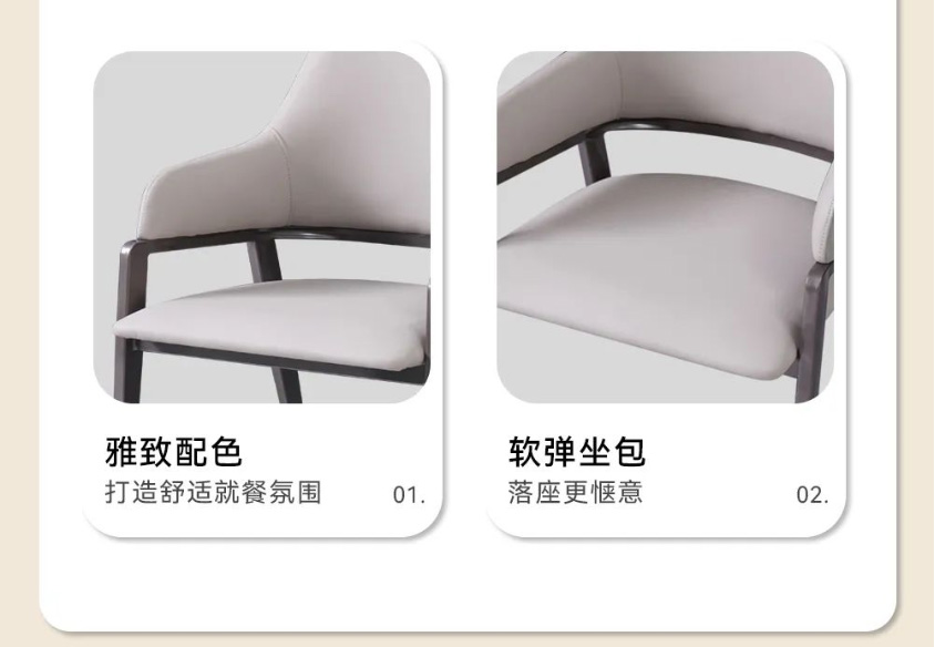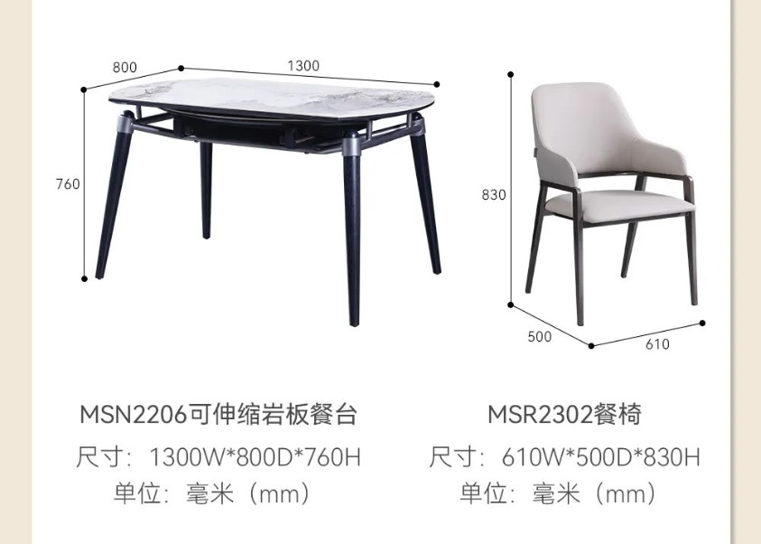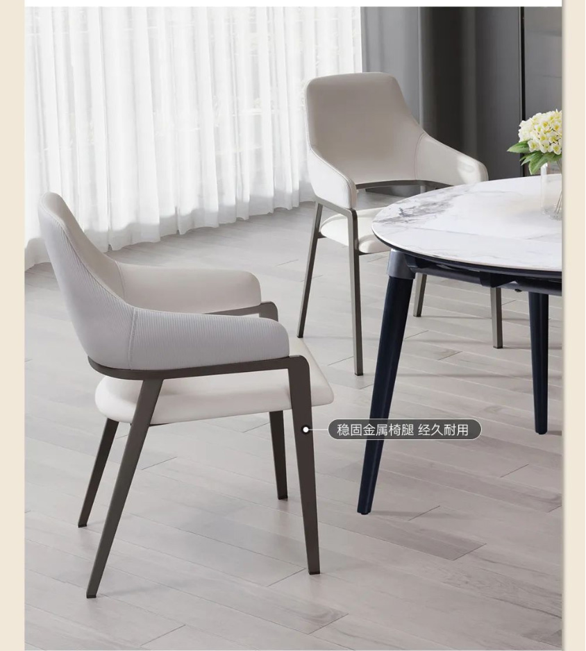 户型餐桌要怎么选才能既省空间又不失美感?MSN2206可伸缩餐桌,简直是小户型的福音!可拉伸的设计,让它可以根据不同场景变换不同的形态,用餐人少时方桌占地少,人多时只需将两侧的半月板拉出,秒变大气圆桌,再多的美味佳肴也放得下!台面选用了香奈儿岩板,纹理写意,淡雅素净;同时,它还具备耐刮磨、耐高温、高密度、食品级别安全等优点,高颜值性能出众。木质导轨质感十足,推拉静音无卡顿,而且还会越用越顺滑;同时桌脚采用了八字斜角设计,视觉上美观通透,日常满足餐椅收纳,打扫卫生也很省心。就餐想要更有仪式感,那就少不了米奢这款雅致餐椅。环抱舒适靠背和宽大海绵座包,落座更惬意,吃饭也更香了!这样舒适与自在的餐厅,真的很难不心动!