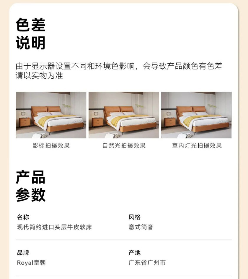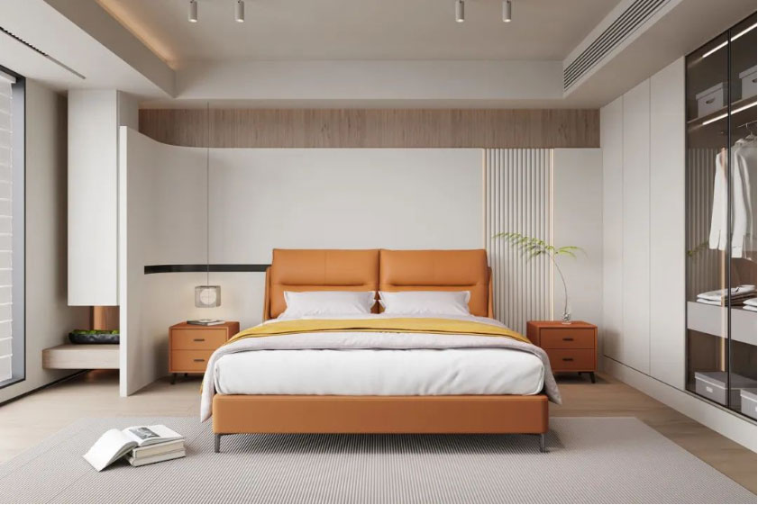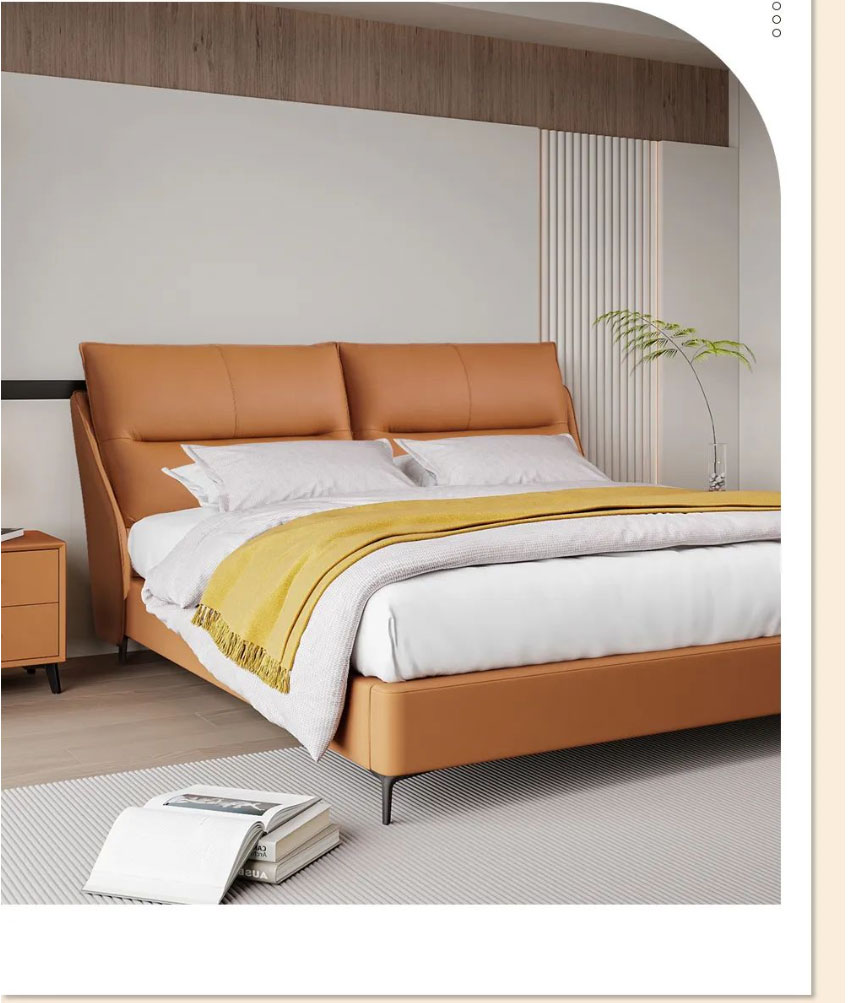 Royal星辰影视米奢系列明星产品软床暖阳,以清新而夺目的橙色系,给整个空间带来无限活力。面料选用进口头层牛皮,质地柔软细腻,触感亲肤舒适;自带倾斜角度的床屏,能更好地贴合我们倚靠时的身体曲线;左右分区双靠包,内部填充高密度高回弹海绵,靠感软弹舒适,轻松消弭一天的疲惫;三面窄边的设计,尽可能避免空间浪费,适配各种现代户型;全实木静音排骨架,结实稳固无异响,让你一觉安睡到天亮;金属床脚高挑轻盈,视觉效果更通透,也方便扫地机日常清洁。搭配的同色系床头柜,高颜值又实用,整体风格简约和谐,营造个性精致、温馨舒适的卧室氛围。
