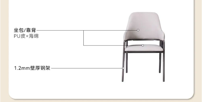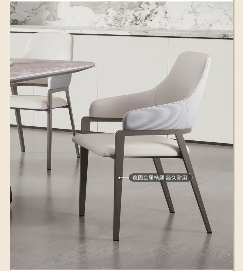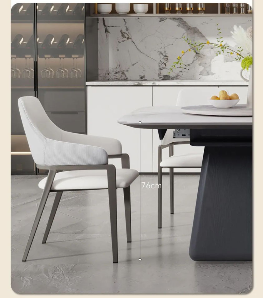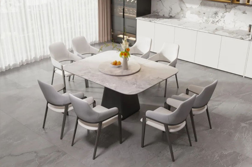 台面选用喜马拉雅彩晶石,天然纹理,诗意优雅,边缘还贴心地做了圆角处理;外嵌360°旋转圆盘,转动不卡顿、无噪音;餐桌采用木质中柱,低调内敛的朴质感中和了石材的清冷,上窄下宽的梯形设计既能稳稳托住台面,又给底部留足了活动空间,做到入座不挡腿。配套的米奢餐椅,以环抱柔软靠背和宽大海绵座包,带来更舒适的落座体验,让你在用餐时更从容惬意。