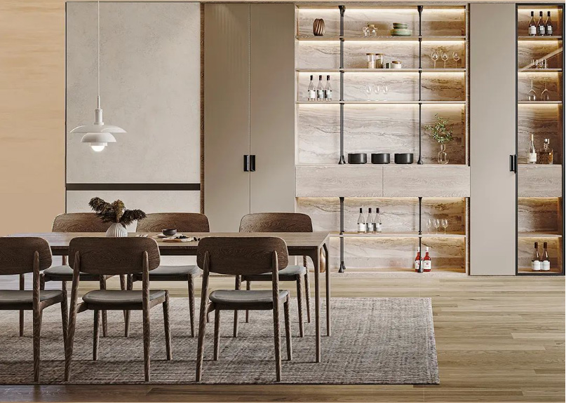 组合餐边柜,虚实结合,保留材料原始质感,经典时尚,呈现质感肌理,高质地、高颜值,大大提升整体视觉空间效果。