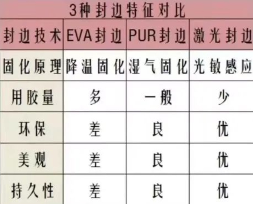 缺点:工艺技术及美观性仅次于激光封边;相同高品质的胶价格比较贵,同品牌的PUR胶价格比EVA胶要贵。